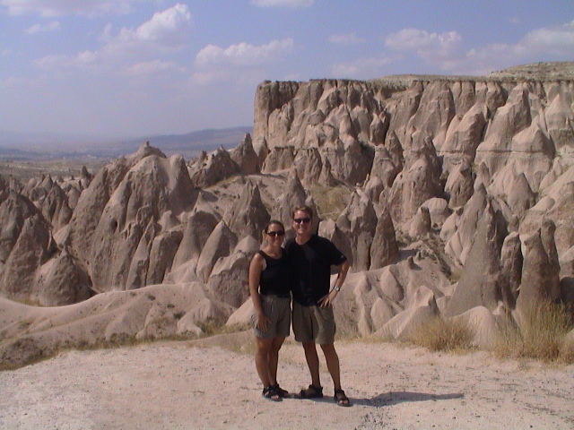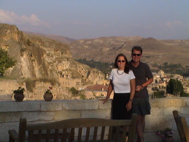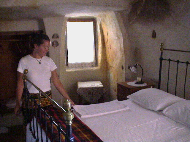 We're not in the habit of mentioning places where we've stayed on our trip, but the Esbelli Evi Pension, where we stayed in Urgup, really deserves special recognition. The pension (which is really more like a boutique B&B) is the result of many years of hard work by its owner, Suha Ersoz. In the 1980s, Suha who bought up two adjoining old rock houses in Urgup, restoring and adding to the existing rooms to create Esbelli Evi. It's a remarkable, relaxing place with all of the creature comforts you could possibly want, yet with a very rustic, homey atmosphere which makes you feel as if you are the guest in some sort of elaborate castle-like home. There are only 10 rooms here, and many of them are original cave rooms from the 5th century AD! We were fortunate enough to get one of these cave rooms. Where else in the world can you stay in a comfortable, beautiful cave room that's also 1500 years old? Esbelli Evi is considered by many to be the best place to stay in all of Turkey, and yet it's priced not far beyond what most three star hotels charge in Turkey. It's a real treasure, and we had a very hard time making ourselves leave! Suha's staff, Sebnem, Koray, Turkah, and Serife were all very helpful and pleasant, doing their best to make us feel right at home. To see more of this outstanding place, visit Esbelli Evi's web site at www.esbelli.com.