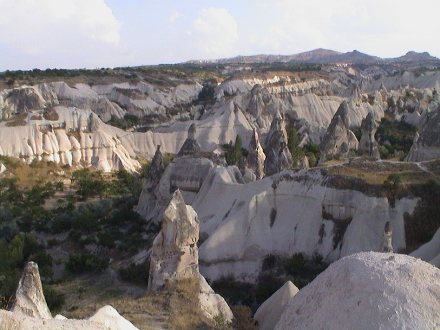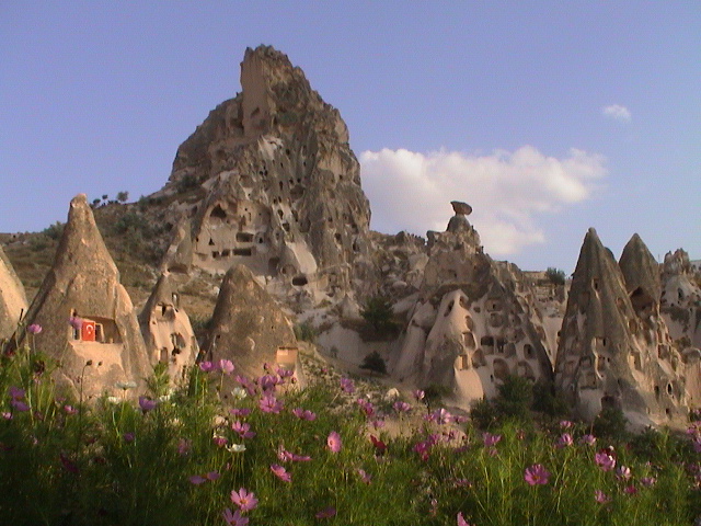 There is nothing that can really adequately describe in words the bizarre, incredibly weird volcanic landscape that exists in Cappadocia. You can look at pictures all you want, but nothing can prepare you for your first sight of the multi-hued volcanic rock which has been carved by erosion into tall "fairy chimneys," tufa cones, and peculiar, wavy-faced hillsides. Adding to these amazing natural features are mysterious cave dwellings which people carved into the landscape many centuries ago. The Cappadocian countryside is something like the Flintstones meets the Moon meets a Salvador Dali painting. It's weird, it's amazing...it's utterly mind-boggling!