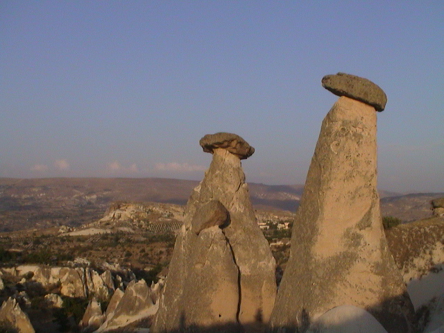You can thank good old Mother Nature for the strange natural landscape here. About 10 million years ago, three giant nearby volcanos erupted, burying the area in a thick layer of gray volcanic ash. Later eruptions spewed out large boulders of harder, darker andesite and basalt, which landed randomly on top of the already-deposited layer of ash. Over time, the ash hardened into a soft volcanic rock called tufa. The hard boulders which sat on top of the tufa protected the underlying tufa from erosion, ultimately creating comical-looking "Fairy Chimneys" -- tall columns of gray or pink tufa capped with large, dark boulders. There are entire valleys of these fairy chimneys, the best of which lies near Zelve, about 7km away from Urgup.