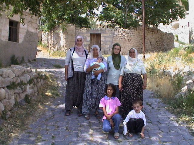 Another nice thing about staying at Esbelli Evi is that it's a bit outside of Urgup proper, in an old part of town with very few hotels and pensions, but with lots of locals. Every time we walked the cobblestone street which led down the long hill to town, we caught a unique glimpse of local life. One day, as we descended from Esbelli Evi, two small children out playing offered to pose for a picture. The next thing we knew, the family matriarch was yelling for the rest of the family to come out for a picture . "Bebek! bebek!" she shoulted to her daughter, the mother of the two cute kids we had met. Bebek is the Turkish word for baby -- Grandma wanted the newest member of the family in the picture, too. Mom came out of the house with kid #3 in tow, a tiny little baby only a few months old. Since all the men were away working (it was the middle of the day), we got a picture of all the women and the kids. We promised to mail them all a couple copies of the pictures we took once we got them developed. Another unexpected case of Turkish friendliness in the back streets of Goreme!