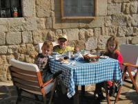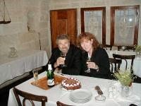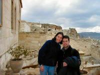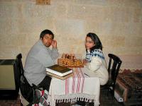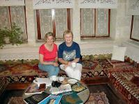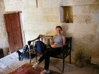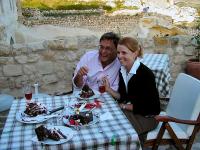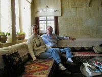 ...or a minute we weren't sure if we had found our place for it was a wall with just an address on the door, but yes, it was the Esbelli Evi Pansiyon. A nice young lady welcomed us, showed us to our room where we left our bags and washed our faces, and then showed us all around the place. This was a great greeting/introduction as she would go to a room like the kitchen and explain that the refrigerator stocked with water and pop and beer was there for us to help ourselves to whenever we choose, the wine and hard liquor were in the cabinet, the stove and things were ours to use if we chose to, and on and on. Like in one room, the computer sitting there was available to use at any time someone else wasn't using it and it was connected to the internet, etc. After the warming tour, we sat out on the patio drinking first cold water and then beer and wine, looking at the great views, eating snacks they provided, and thoroughly unwinding. Clearly this was going to be a fine home for awhile. We then asked them about good dinner choices and the young lady suggested one. And, since she was heading down town now that she was off work, she gave us a ride to the restaurant...