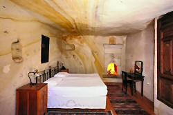 On the upper floor the reception and reading room are outfitted with antique Turkish rugs and low brass tables. Downstairs are the bedrooms, a labyrinth of caves hollowed out from the soft limestone rock of the hillside. The smooth, honey-coloured stone of the walls is both cool and atmospheric. These cave rooms are furnished with beautiful kilim rugs and antique brass beds, and some include a fireplace.